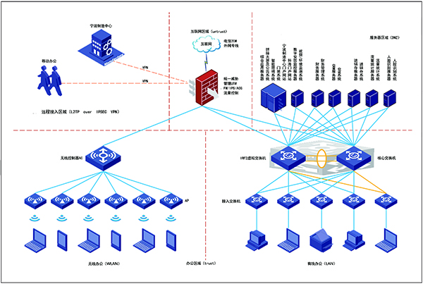 遵循安全、可靠、稳定、高效的原则,把网络划分成5个区域。分别是远程接入区域(L2TP over IPSEC VPN)、互联网区域(untrust)、服务器区域(DMZ)、办公区域(trust),其中办公区域分为有线办公区域(Lan)和无线办公区域(Wireless)。