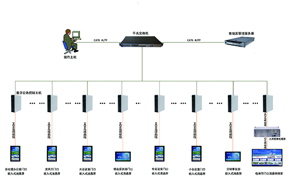 整个办公区采用数字公告系统实现信息发布显示,遵循安全性、稳定性、可扩展性、管理维护便捷性的设计原则,C/S与B/S结合的架构,网络及服务器占用率极低,数据安全存储并管理,开放的API接口。整个办公区设计8套显示终端,覆盖办公区主要进出口通道及公共区域,系统通过中央控制端对各个显示终端进行统一管理、内容发布。