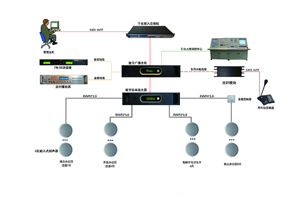 近年来,办公大楼、购物中心和其他大规模建筑工程对于公共广播系统能够具备呼叫分配、播音、背景音乐及对建筑物内的特定区域进行常规信息播放的功能之要求日益增加。科海办公楼广播系统的设计,顺应潮流和科技发展趋势,从投资合理、外观美观、设计规范的设计原则出发,要求广播系统具备如下功能:①兼顾背景音乐、公共广播、消防广播的功能;②全数字结构;③结合防火分区划分广播分区;④各广播分区独立音源、独立广播;⑤紧急广播具备优先控制权。
