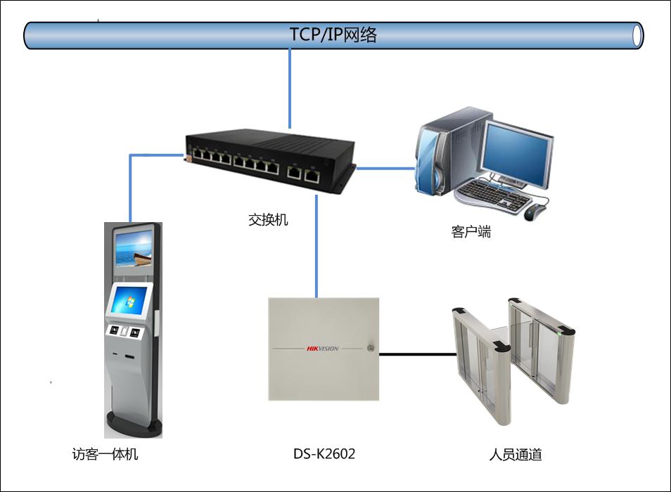 人员出入口控制系统由感应IC卡、感应读卡器、速通门设备、通道闸控制器、出入口管理软件及工作站等组成。根据出入口通道管理需要,设计选用网络型通道控制主机,通道控制器采用TCP/IP通讯方式进行与上层管理层通讯方式,支持联机或脱机独立运行。每个通道控制器可以控制1个通道,系统架构图如下: