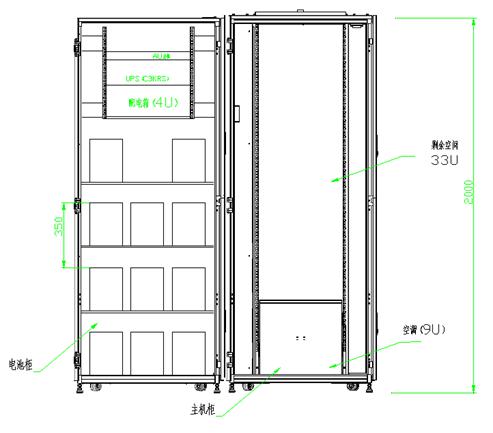 当要求超长后备时间,例如1小时,2小时等,如果主机柜内部空间不够,此时我们会配套一个外形跟主机柜类似的电池柜,它主要作用是放置后备电池,此电池柜前后侧门各方面技术参数参数与主体机柜无异,保持外观一致性,整洁美观,只是机柜内部不需要有冷热封闭功能,不需要有监控门及其天窗状态等。