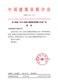 在2012(第3届)置业中国/工程建设国际峰会上,中国建筑业联合会为表彰先锋、树立榜样,充分发挥优秀施工企业在我国建设工程领域的导向作用,经施工企业层层选拔推荐,最后由中国建筑业联合会评审委员会审定:云南爱体育(中国)官方网站-登录入口有限公司获选“2012全国工程建设优秀施工企业”。