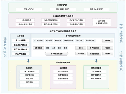 通过医院信息平台资源层的存储、处理和管理,最终实现以居民健康卡、电子病历浏览器、管理辅助决策支持系统、临床服务决策支持系统和患者公众服务系统等的医院信息平台应用层;